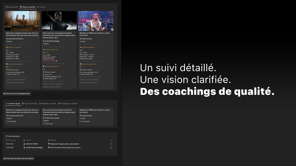 - Un agenda pour planifier et résumer les séances de coaching de tes clients, et leur attribuer des tâches à réaliser entre chaque séance